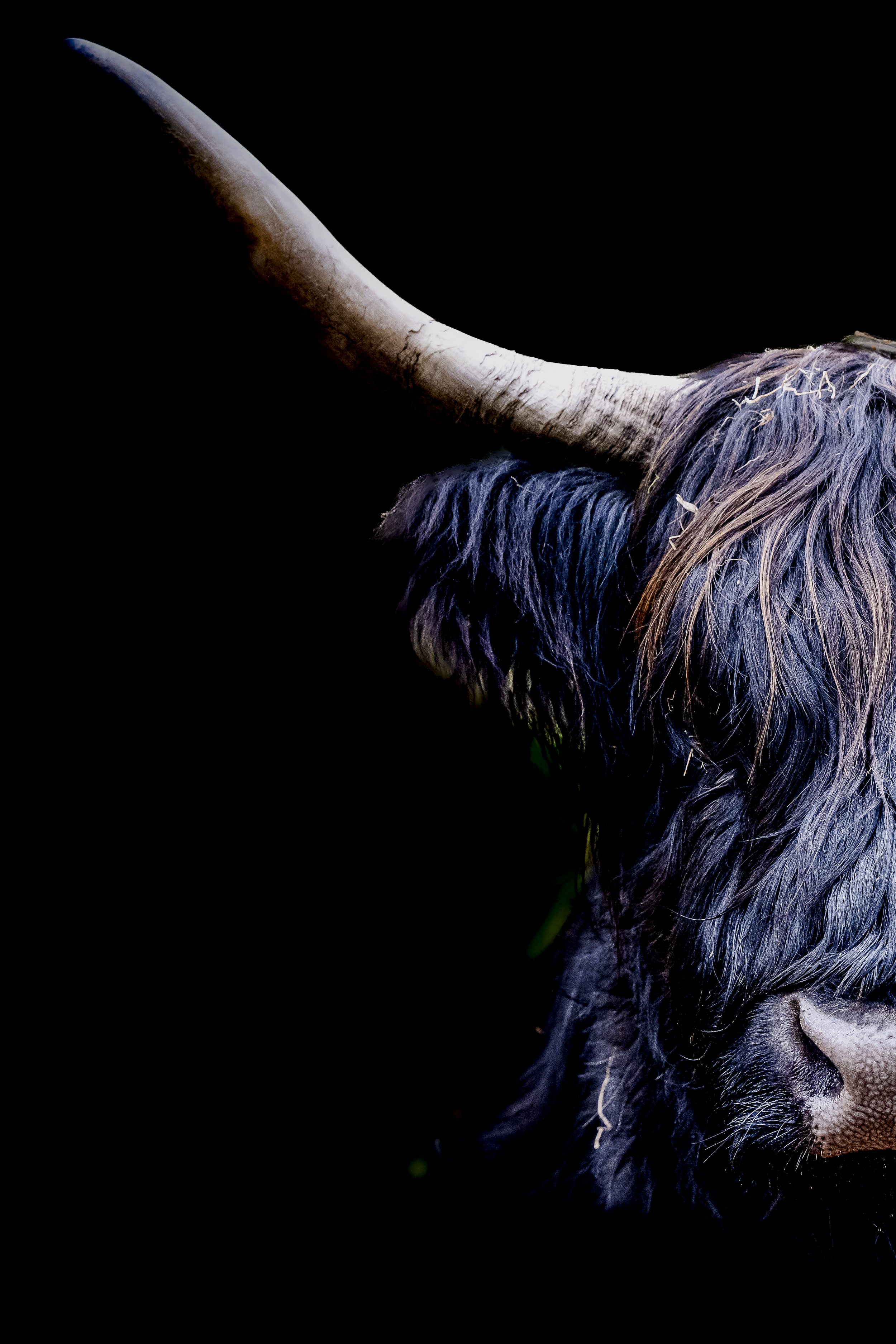 Highland cows are instantly recognisable, but it’s often their quieter moments that reveal the most character. This dark-coated Highland cow portrait was captured as a full and half-portrait, allowing the texture of the coat and the expression and the hidden eyes to take centre stage.